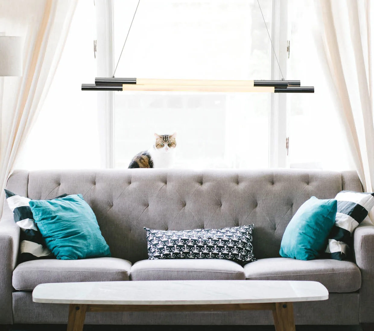 Kρεμαστό φωτιστικό τύπου ράγα με φωτοσωλήνα και μεταλλική βάση.