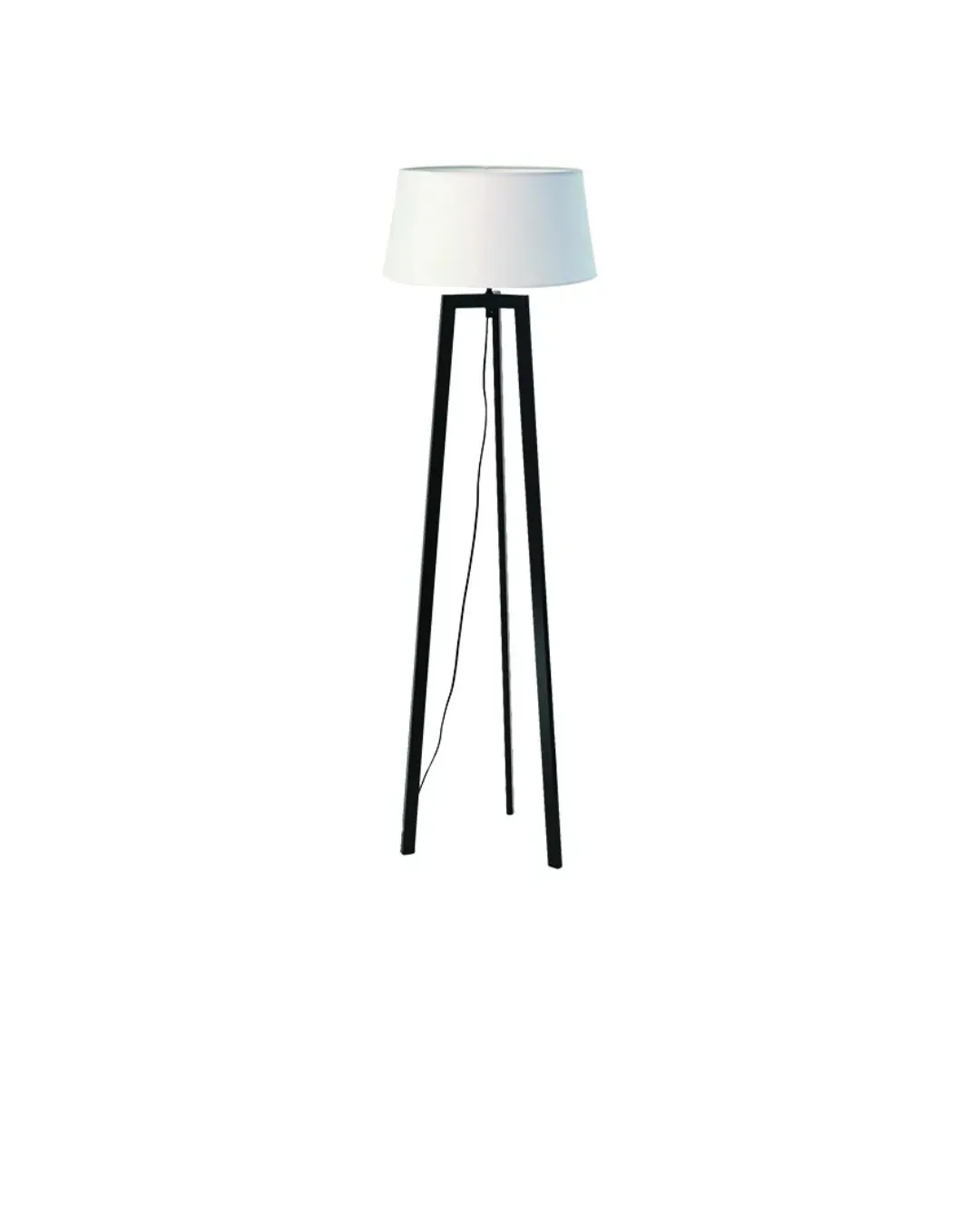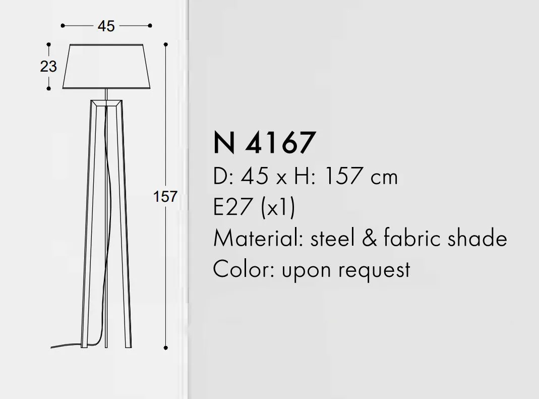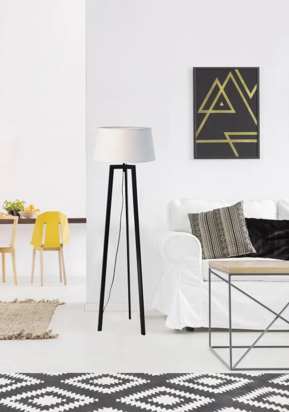Φωτιστικό δαπέδου από μεταλλικό τρίποδο και υφασμάτινο αμπαζούρ.